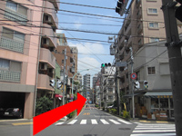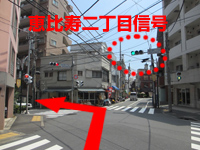7) 恵比寿二丁目の信号を左折、角は八百屋さん